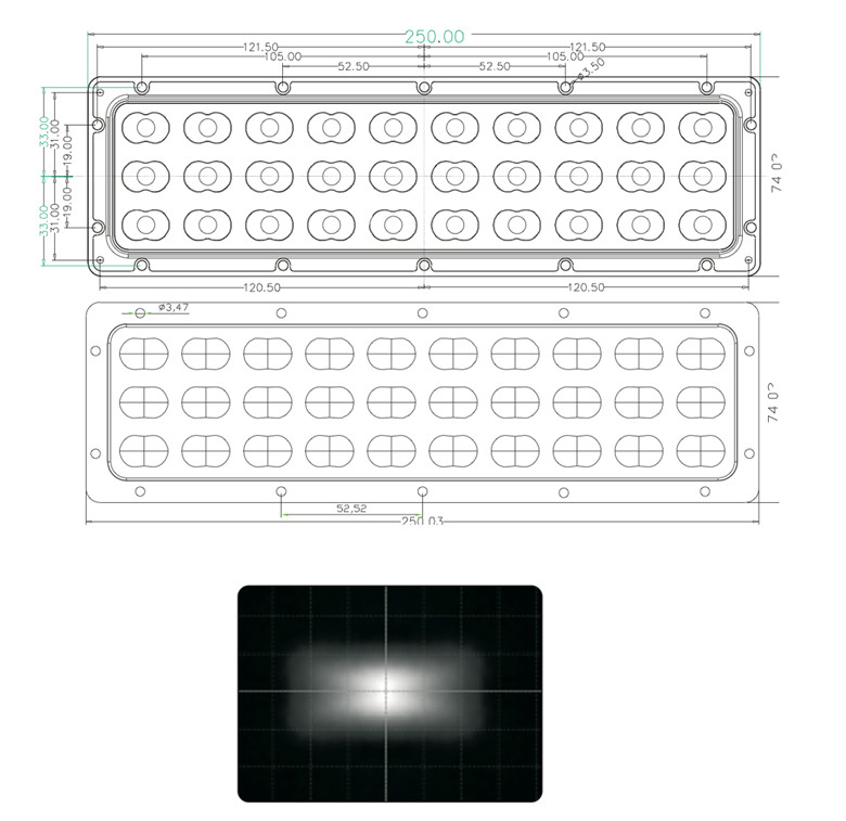 | زاویه پرتو :: | درجه 65X120 | اندازه لنز:: | 250X74mm |